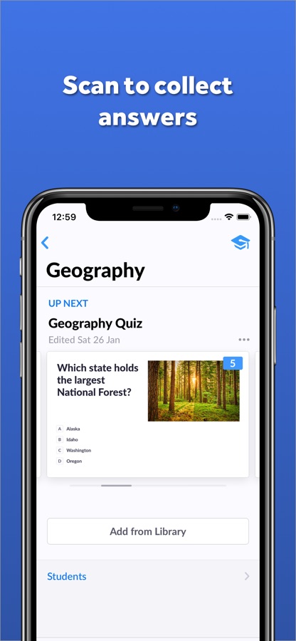 Plickers lets you poll your class for free, without the need for student devices. Just give each student a card (a «paper clicker»), and use your iPhone/iPad to scan them to do instant checks-for-understanding, exit tickets, and impromptu polls. Best of all, your data is automatically saved, student-by-student, at plickers.com.