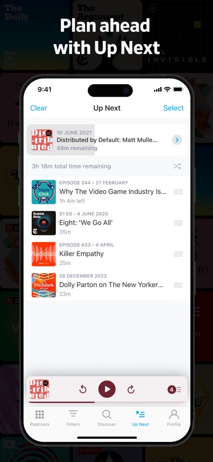 • В очереди: автоматическое создание очереди воспроизведения любимых эпизодов. Выполните вход, и функция «В очереди» синхронизирует список воспроизведения на ваших устройствах.