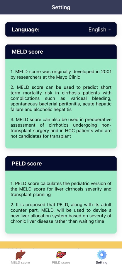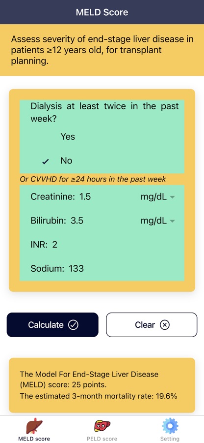 «Калькулятор Очков MELD: Пересадка Печени» — это приложение для расчета баллов по модели терминальной стадии болезни печени (MELD) для пациентов в возрасте от 12 лет и старше. Модель конечной стадии заболевания печени (MELD) — это перспективно разработанная и проверенная система оценки тяжести хронического заболевания печени, в которой используются лабораторные показатели пациента. У пациентов с циррозом повышенная оценка модели терминальной стадии заболевания печени (MELD) связана с увеличением тяжести печеночной дисфункции и повышенным трехмесячным риском смертности. В этом приложении вы также можете рассчитать педиатрическую версию оценки MELD (оценка PELD), которая используется для детей в возрасте до 12 лет.