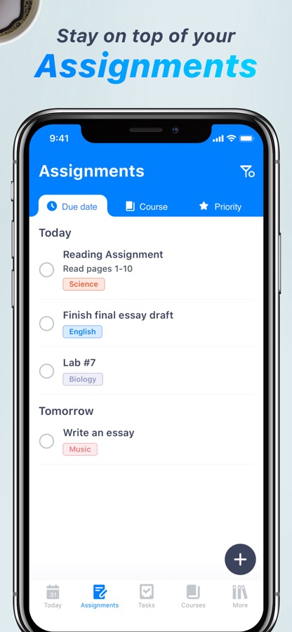 Kinds of sections are designed to track down all your assignments easily and intuitively. You can either organize your assignments by date, by course or by priority or sort them by completed or uncompleted.