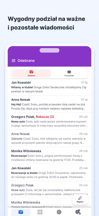 Konwersacje — łączymy wiadomości i odpowiedzi w konwersacje, w porządku chronologicznym.
