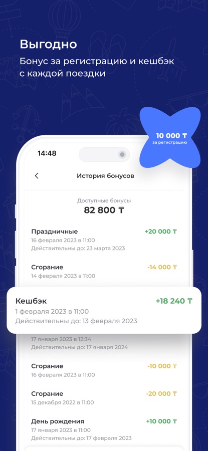 ⁃ Выгодно. 10 000 тг бонусов за регистрацию и кешбэк с каждой поездки .