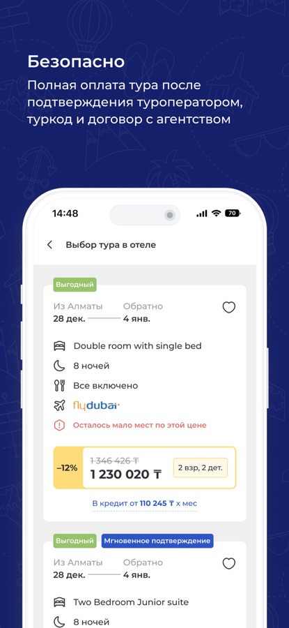 ⁃ Экономия времени и удобная оплата. Бронирование онлайн, оплата картой или в кредит прямо в предложении, выбор туров и консультации без посещения турагенства.