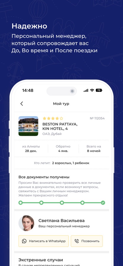 ⁃ Безопасно и комфортно. Персональный менеджер сопровождает вас До, Во время и После поездки. Забота о вашей безопасности превыше всего.