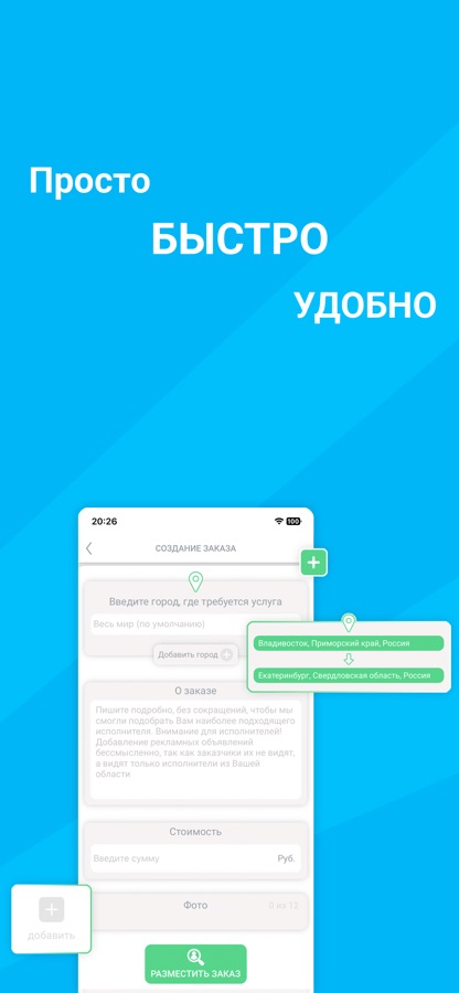 Простой интерфейс приложения позволяет легко найти подходящую для Вас работу или клиентов для оказания услуги, а также компетентного исполнителя как для долгосрочного проекта, так и для срочной задачи.