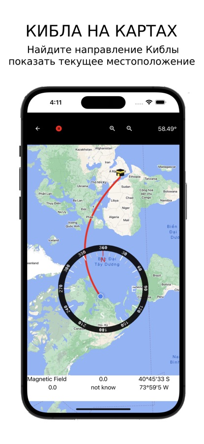 — Направление Каабы: мы используем умный компас в сочетании с компасом карт, чтобы найти местоположение киблы.