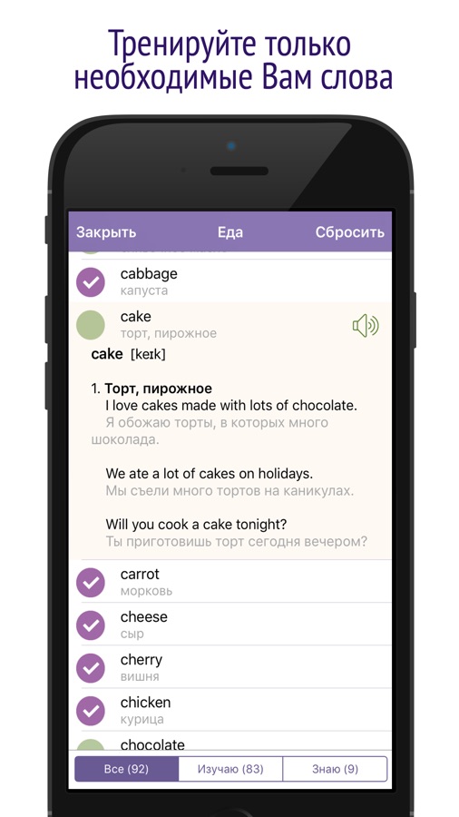 Все слова разделены по категориям, в каждой категории можно отметить слова которые вы уже знаете и учить только необходимое.