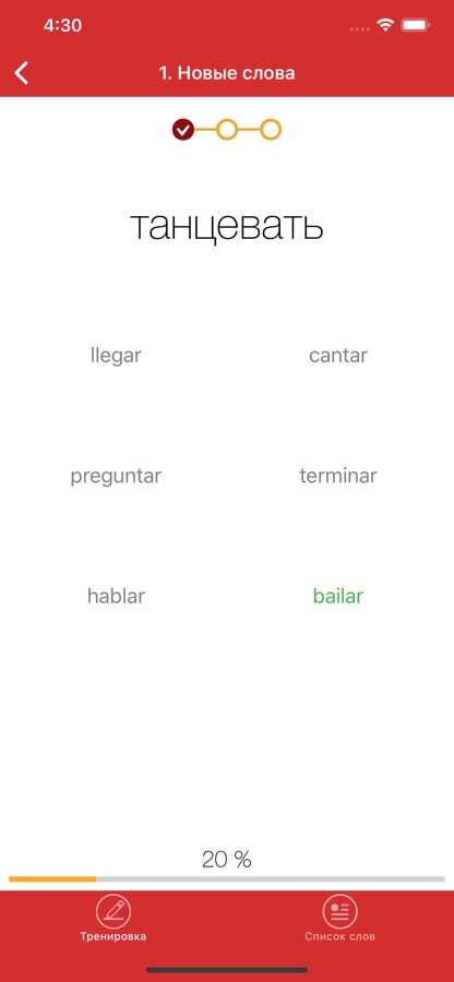 Из слов на экране вам нужно составить перевод на испанском языке.