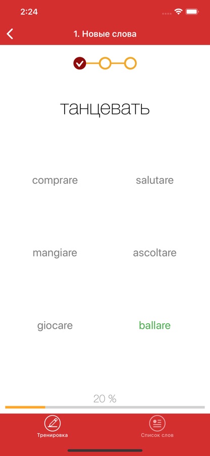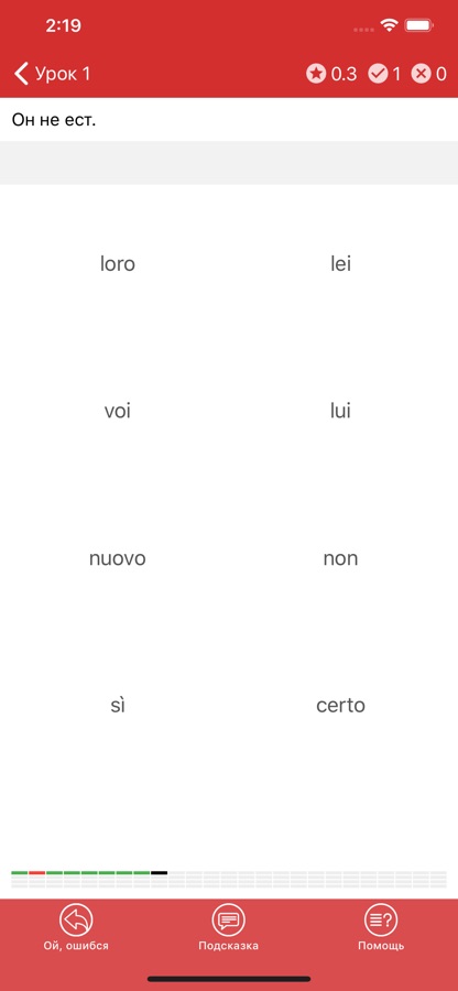 Из слов на экране вам нужно составить перевод на итальянском языке.