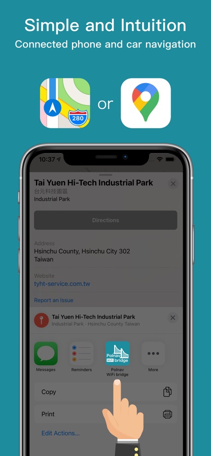 No matter you are accustomed to using text or voice input on your cell phone, Polnav WiFi bridge helps you to connect your cell phone to Polnav as soon as you find your destination in Apple Maps or Google Maps.