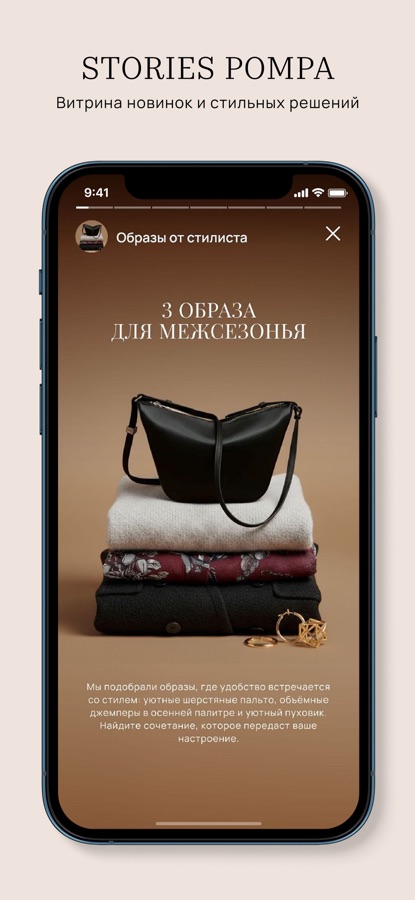 Знакомиться с новыми коллекциями в мобильном приложении Pompa быстро и просто! Удобная система навигации поможет с лёгкостью найти нужный товар, посмотреть размеры и наличие в магазинах.