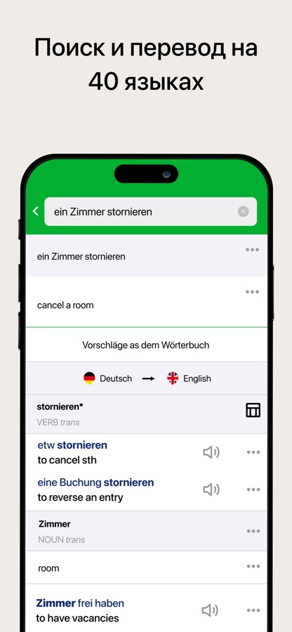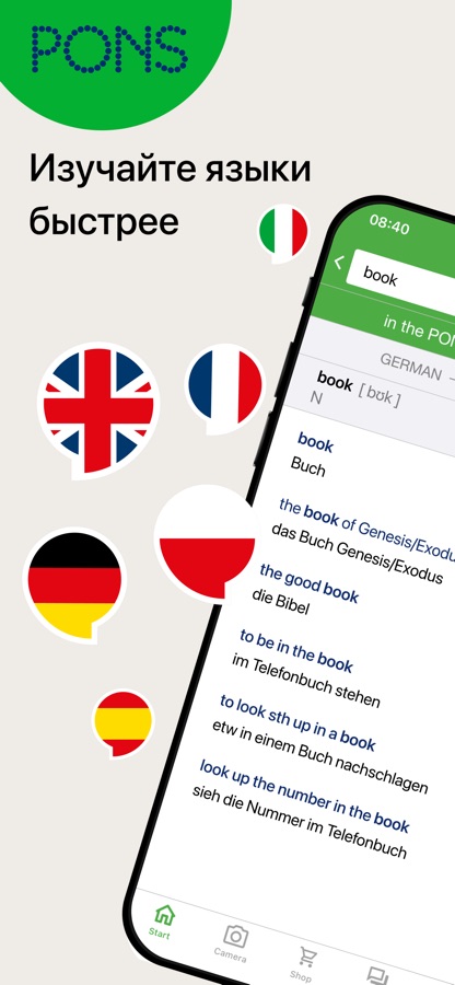Введите искомое слово через клавиатуру или речевой ввод и Вам будут предложены слова и выражения для удобного и быстрого поиска. Если приложение не найдет искомое в словарях PONS, подходящий перевод предложит функция перевода текста. Поиск возможен и без ввода через клавиатуру: с помощью камеры Вашего телефона Вы можете непосредственно переводить меню, вывески и прочее.