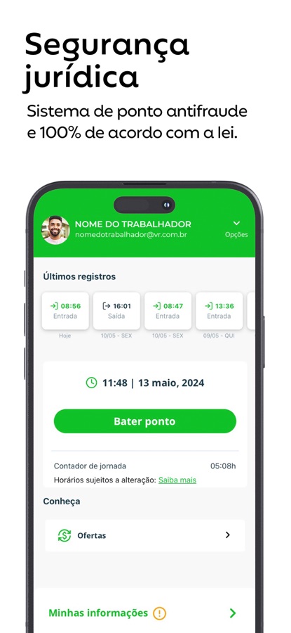 Com nosso aplicativo o colaborador pode fazer registro de ponto diário, receber alertas e notificações, consultar informações sobre banco de horas e horas extras, justificar faltas e atrasos e solicitar férias tudo pelo celular.