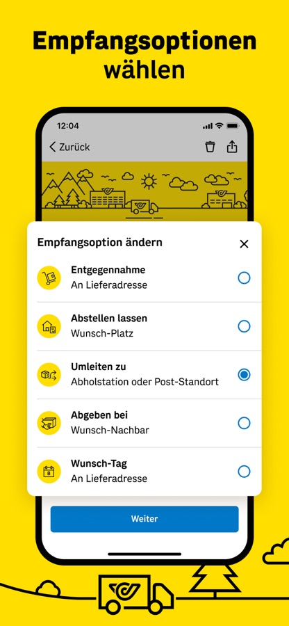 Wir wissen, Dinge ändern sich. Auch während Ihre Sendung bereits unterwegs ist, stehen Ihnen verschiedenen Empfangsoptionen zur Verfügung: Der Versand in eine österreichische Post Geschäftsstelle oder Abholstation, zu IhremWunsch-Nachbarn, an einen von Ihnen bestimmten, sicheren Wunsch-Platz oder auch die Zustellung an einem anderen Lieferdatum. Sie entscheiden, wann und wie Sie Ihre Sendungen tatsächlich empfangen.