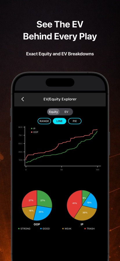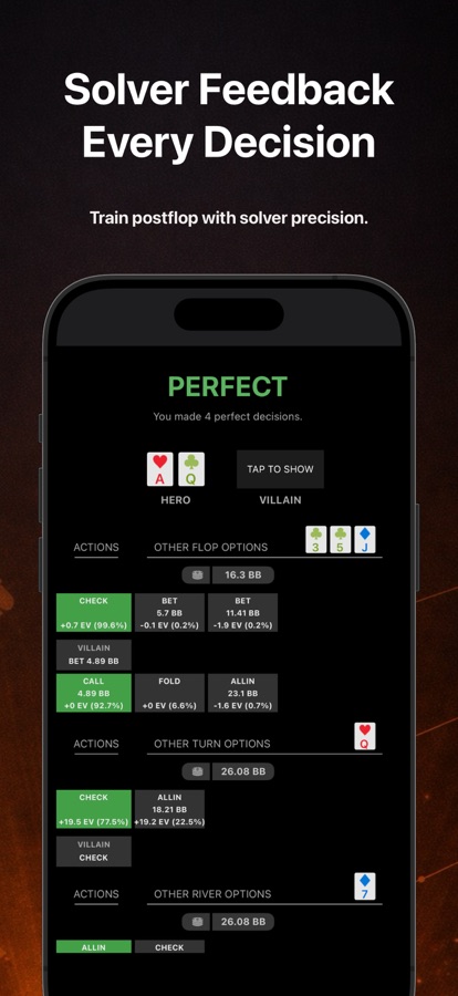 Every spot is professionally solved to high accuracy. Every decision gets instant GTO feedback with exact frequencies, bet sizings, and EV impact. Watch ranges narrow in real time as the hand progresses, then replay and explore different lines to understand why GTO makes each decision.