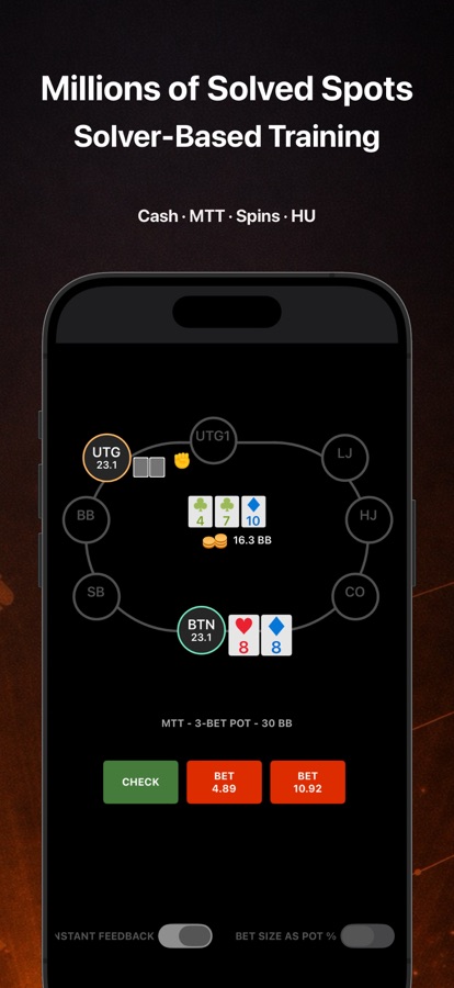 • Millions of GTO Spots — Cash, MTT, Spins, Heads-Up across multiple stack sizes and positions.