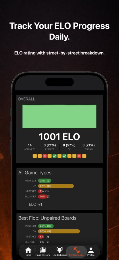 • Leaderboards — Compete against the Postflop+ community weekly, monthly, and all-time.