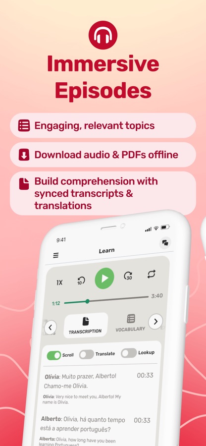 • 800+ Portuguese dialogues with translated subtitles, speed controls, vocabulary & expressions list, and comprehension quizzes. New episodes added regularly!