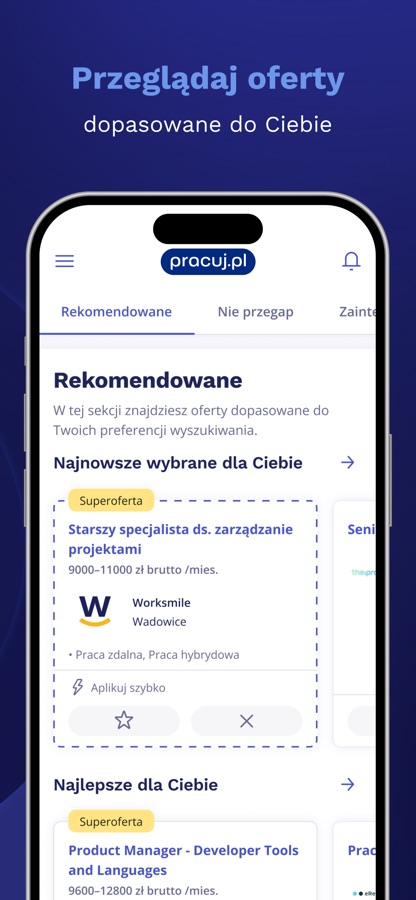 W aplikacji Pracuj.pl zebraliśmy dla Ciebie tysiące ogłoszeń w Polsce, odpowiadając tym samym na potrzeby zarówno początkujących, jak i doświadczonych ekspertek oraz ekspertów w każdej branży.