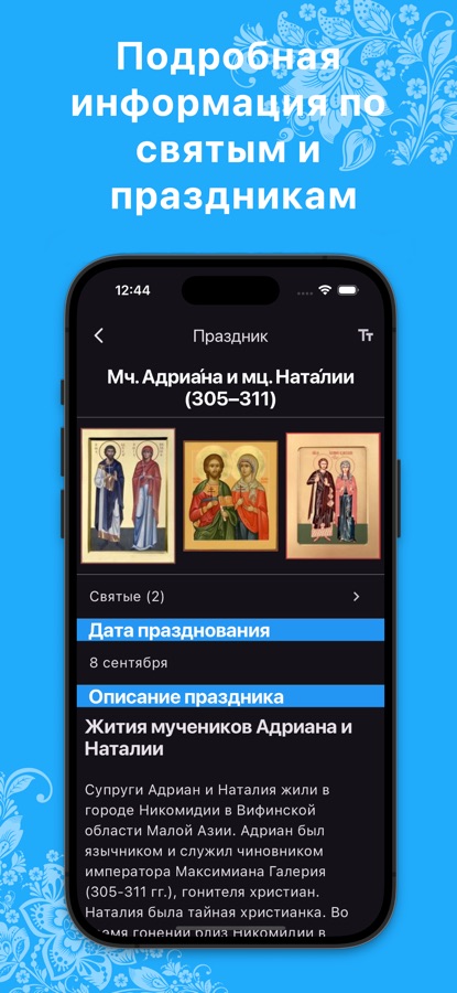 ∙ Подробная информация о праздниках, святых и Богородичных иконах на каждый день.