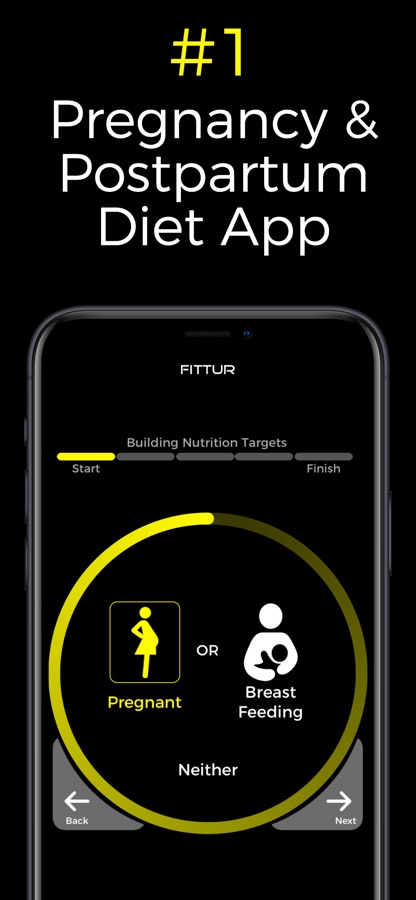 The Fittur pregnancy and postpartum diet app guides your nutrition during pregnancy. Balances your nutrition during the critical breast feeding stage. Then helps you transition to your ideal body composition after pregnancy. You can even transform your app into a life long calorie counter and macro tracker.