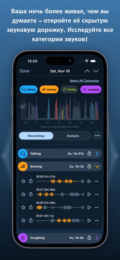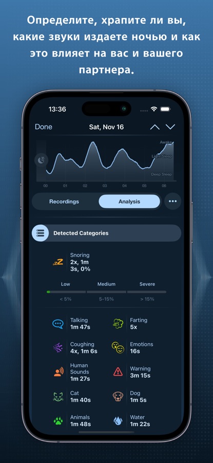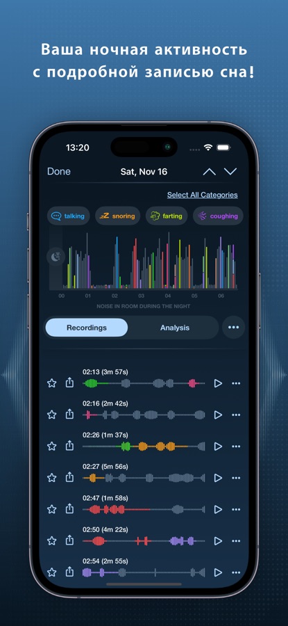 Приложение записывает ваш разговор во сне или храп, пока вы спите (автоматический или устанавливаемый вручную уровень чувствительности, запись только храпа с помощью функции интеллектуального обнаружения храпа), формирует график уровня шума ночью в комнате, снижает общее время храпа за ночь.