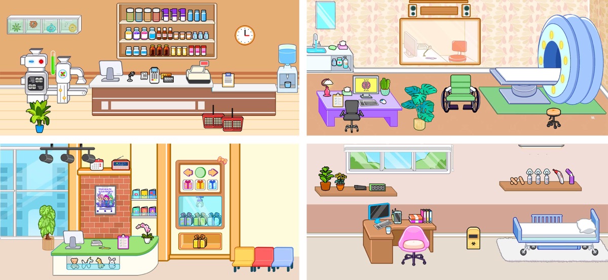 — Больница/клиника: диагностируйте и ухаживайте за пациентами, как врачи и медсестры, или будьте беременной принцессой или больной девочкой.