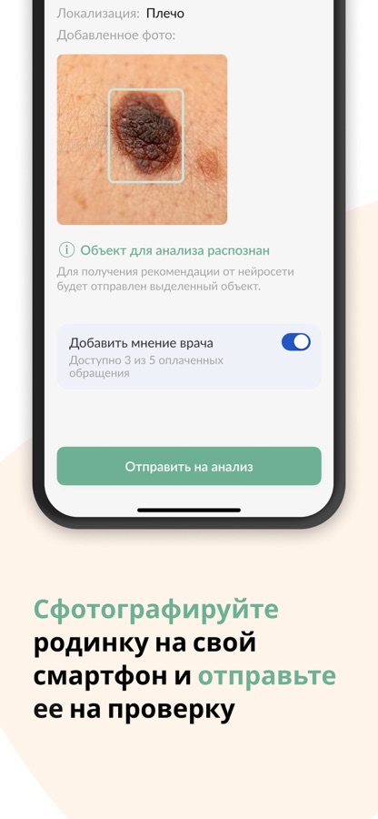 Предлагает выбрать из галереи или сделать камерой смартфона фото подозрительной «родинки» и указать дополнительные данные о ее локализации на теле и типе кожи.