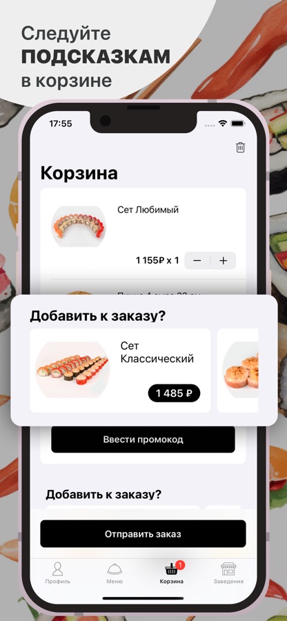 Как сделать заказ в приложении “PRO SUSHI”: выберите понравившиеся позиции из меню, добавьте их в корзину и перейдите на экран оформления заказа (по нажатию на иконку корзины).