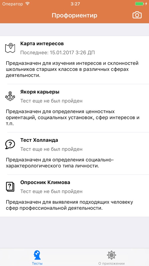 Приложение «Профориентир» поможет лучше разобраться в карьерных предпочтениях, четко обозначить сферу интересов и определиться с будущей профессией. В удобном и наглядном виде можно пройти основные тесты по профориентации, среди которых «Карта интересов», «Якоря карьеры» и тест по определению типа личности. Тесты можно проходить несколько раз или в несколько этапов, а результаты сохраняются в удобном виде для дальнейшего обсуждения. Будет полезно для школьников и их родителей. Приложение является прекрасным дополнением в бумажной версии дневника «Профориентир».