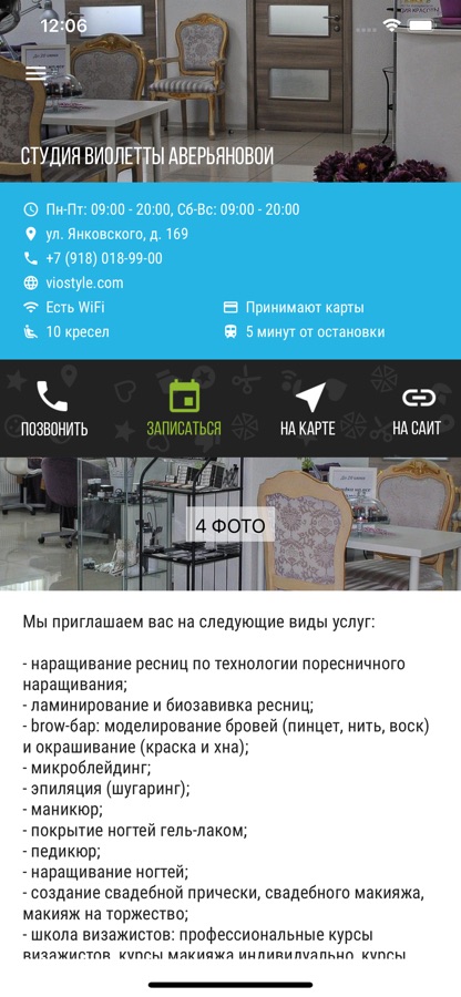 • Просматривать информацию о салоне – режим работы, адрес и телефон, фото интерьера