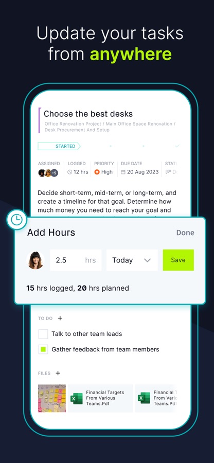 Log task hours on the mobile app, and see hours previously submitted by you and other team members. Our many time tracking features help you stay on schedule and keep your resources balanced.