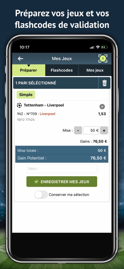 En plus de nos pronostics, vous apprécierez les historiques et classements de chaque équipe. Vous préparerez ainsi vos jeux (sous forme de Flashcodes de validation) de la meilleure des façons possible et vous pourrez suivre les résultats de vos pronos en temps réel (dans l’application ou par l’intermédiaire de notifications pushs).