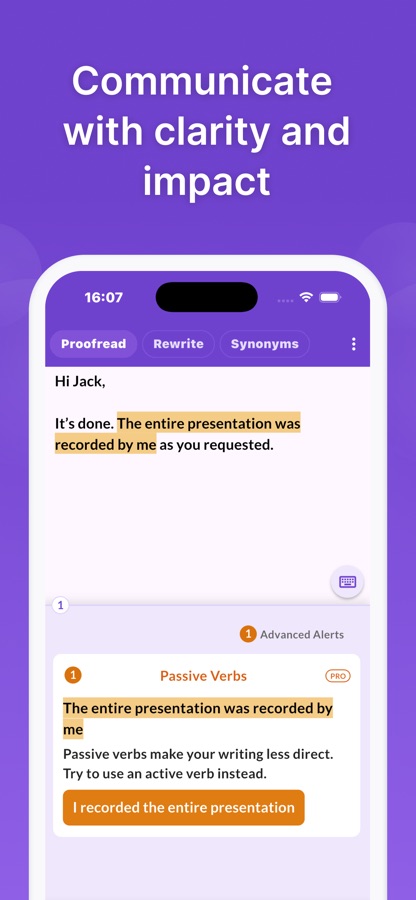 • Proofread Flash (Keyboard only)– Instantly fix grammar, spelling, and punctuation with clear highlights and one tap to accept all.
