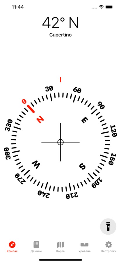 Приложение предлагает различные варианты оформления компаса. На экране может отображаться информация о местоположении, высоте и времени захода/восхода солнца. Также из приложения можно включить/выключить фонарик.