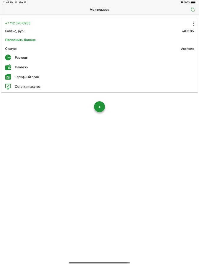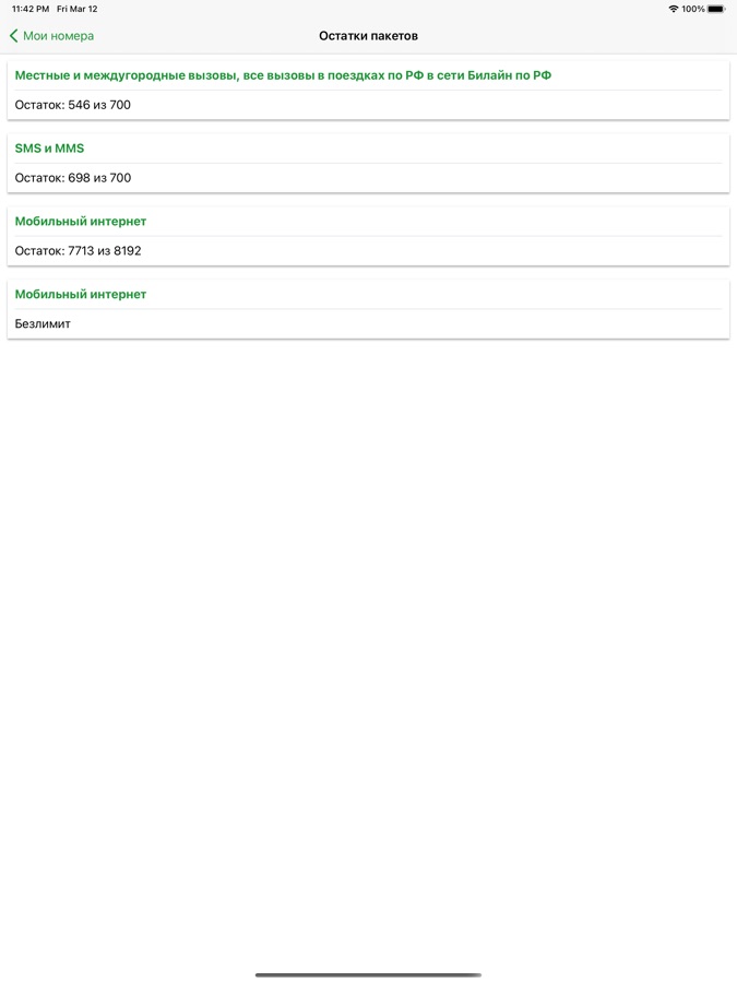 Просмотр баланса, остатков пакетов минут, интернета и сообщений.