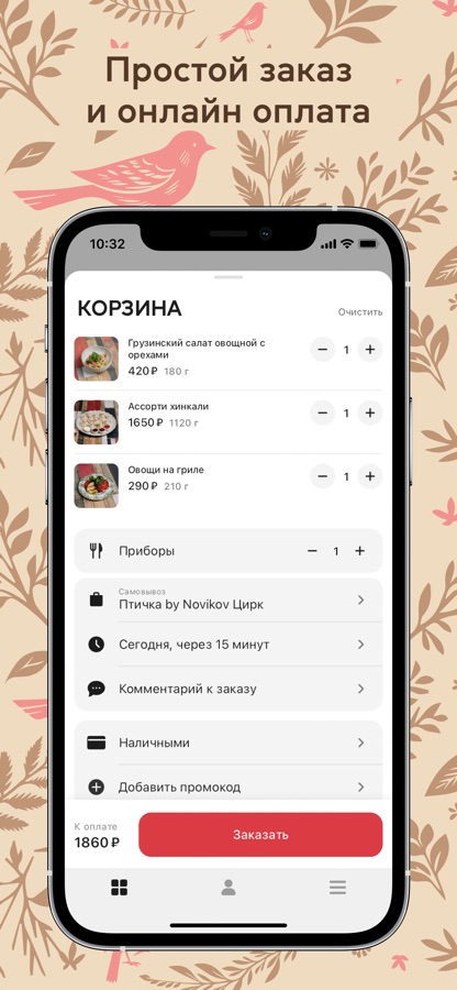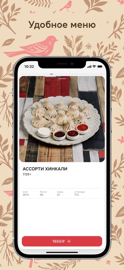 Удобное приложения для доставки из ресторана «Птичка by Novikov. Маленькая, но гордая хинкальная»