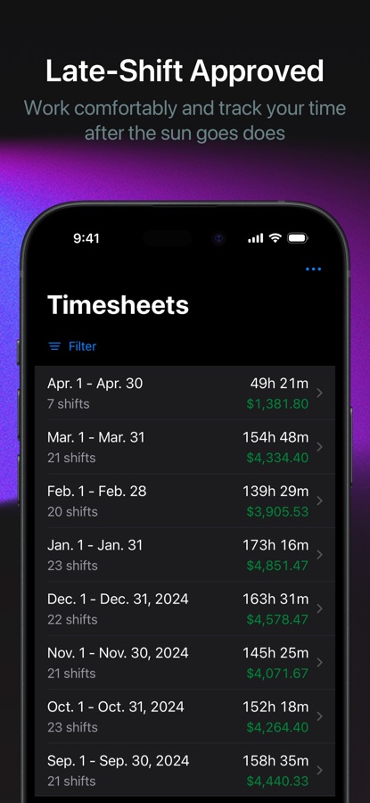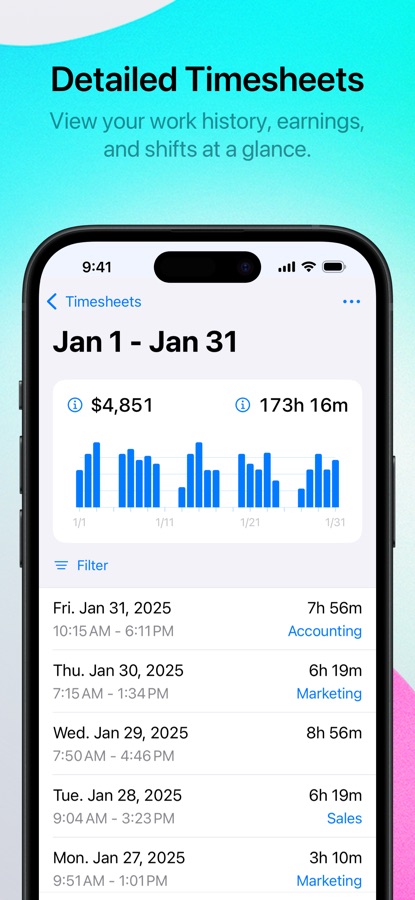 View detailed timesheets showing your hours worked and estimated earnings. Perfect for tracking your work history.