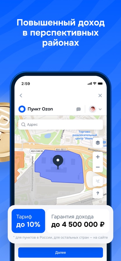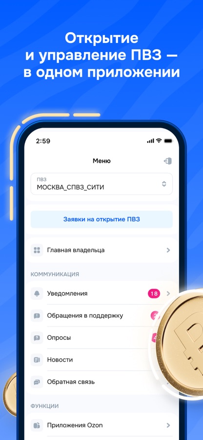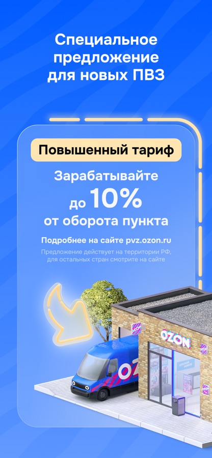 «Пункт Ozon» — приложение для открытия пункта выдачи заказов и управления им. Запускайте ПВЗ и зарабатывайте вместе с Ozon — финансово поддерживаем новые пункты и рассказываем об их открытии покупателям поблизости.