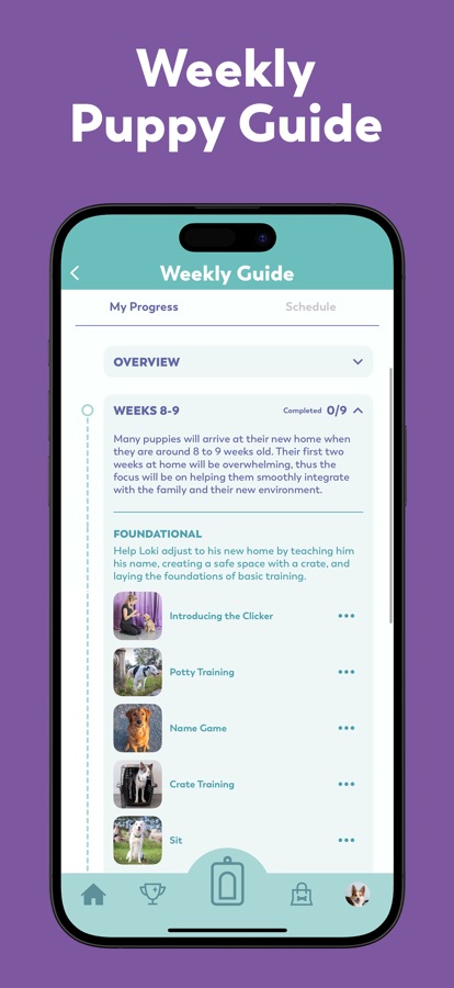 • Weekly Puppy Guide that provides week-to-week breakdowns about your puppy’s developmental stages, training areas to focus on, and a daily schedule for training/potty/sleep times