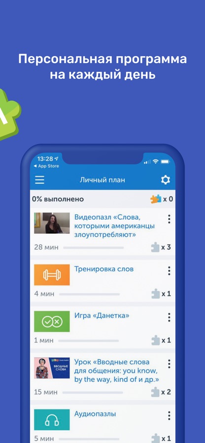 Персональная программа обучения, которая составляется в соответствии с вашим уровнем, целями и желаемым временем. Занятия по Личному плану включают в себя все задания и игры из приложения Puzzle English.
