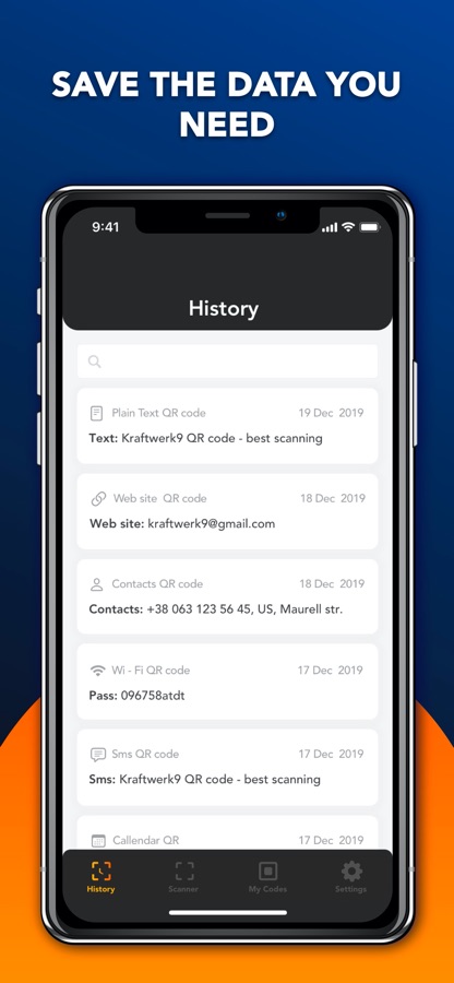 Each card contains information about a scanning date and it is conveniently marked depending on the type of data contained in QR Code. You can also search scanned results.