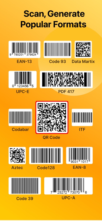 — Supported code types include QR Code, Barcode, Aztec, Codabar, Data Matrix, PDF417, ITF, Code128, Code93, Code39, EAN-8, EAN-13, UPC-A, and UPC-E among others.