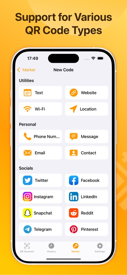 — Supports all types of QR codes including links, contacts, messages, emails, locations, Wi-Fi, social accounts, and many more.