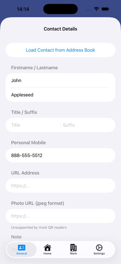 Pick an entry from your address book or fill out your own data and create a personal and a business QR code. QR codes are device independent and can be read from most mobile devices and smartphones. There is no easier way to share your contact information!