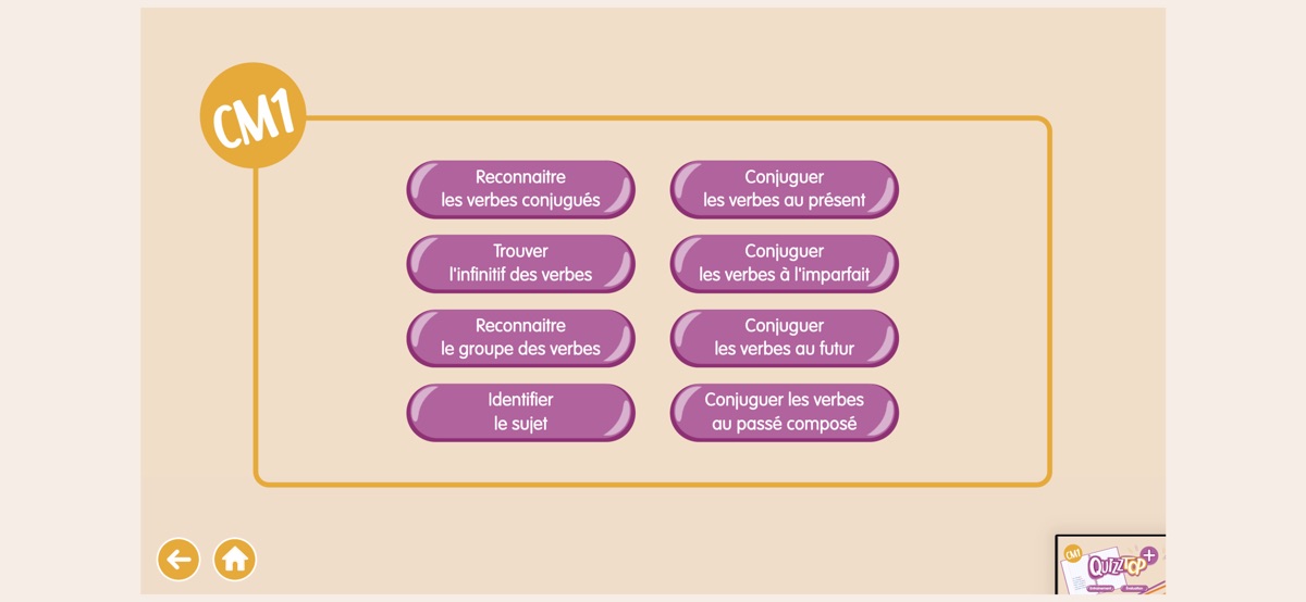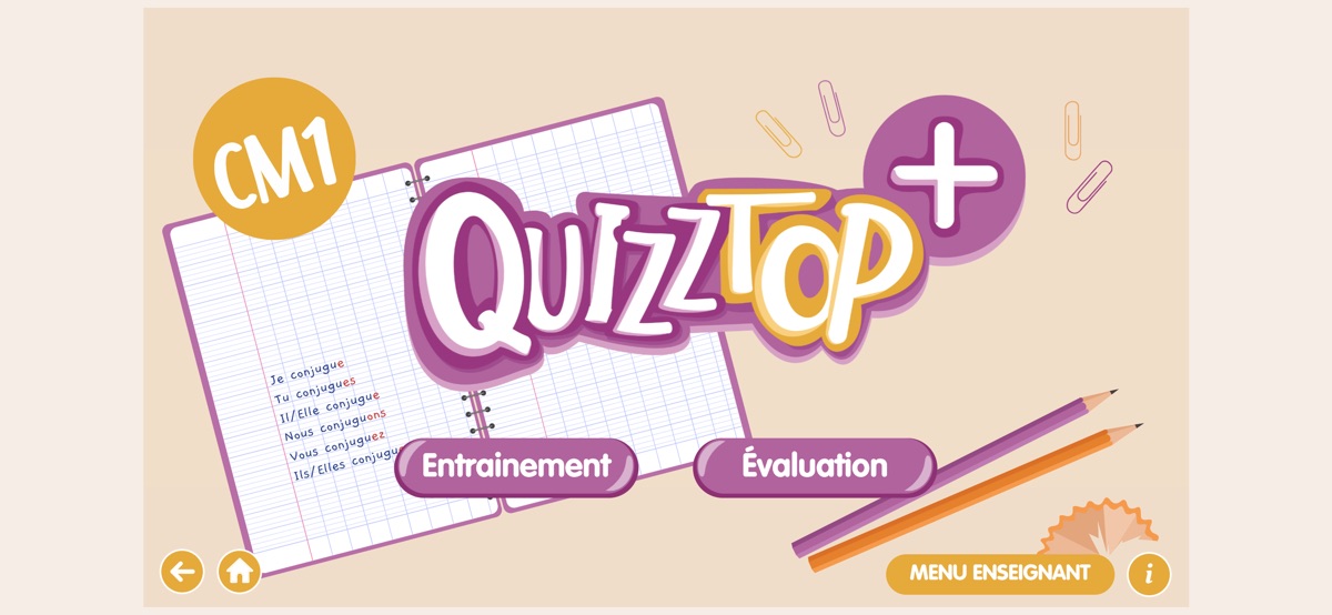 Quizztop+ Conjugaison CM1 propose 8 exercices déclinés en 3 niveaux :