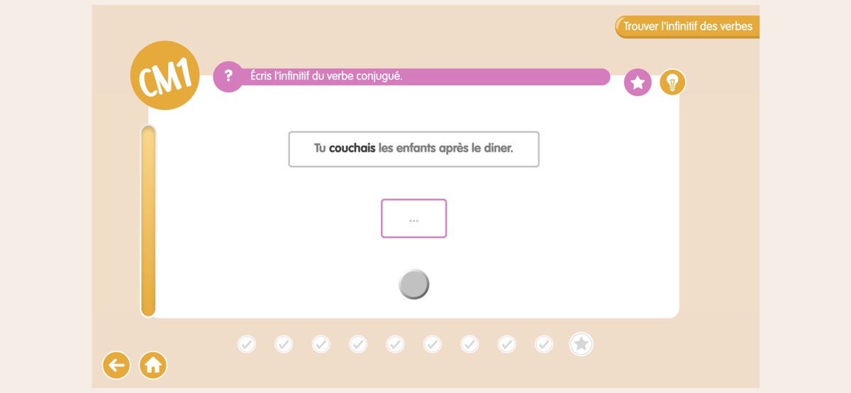Quizztop+ Conjugaison CM2 propose 10 exercices déclinés en 3 niveaux :