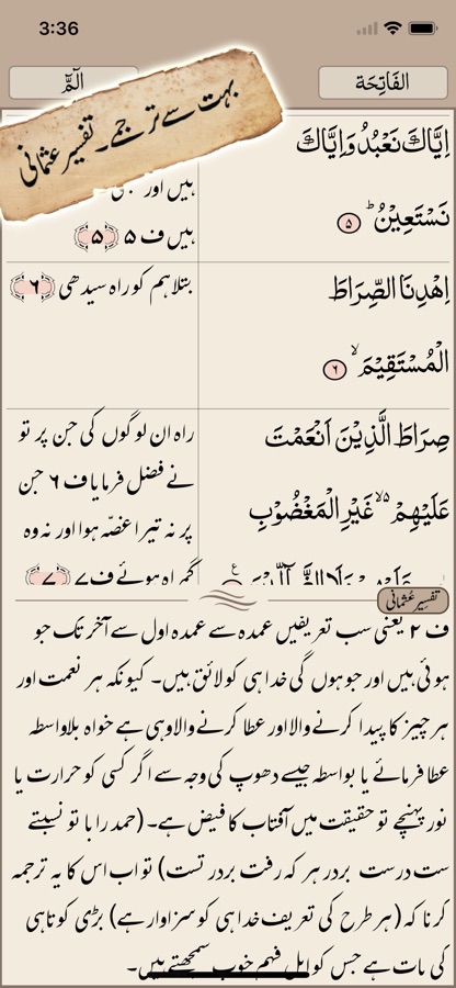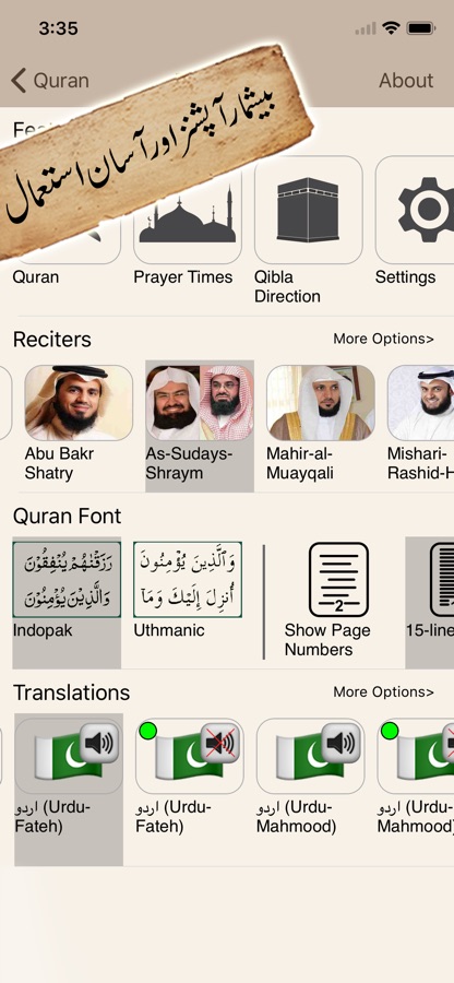 ● Four Urdu translations (For 1st Juz/para only in free version): Mutfi Mahmood Hasan, Maulana Ashraf Ali Thanvi, Maulana Ahmed Ali Lahori, Maulana Fateh Muhammad Jalandhari along with the specially featured Urdu Tafsir Usmani (juz 1 only for free version). Full version has four English translations (Pickthal, Dr. Mohsin, Mahmood & Yusuf Ali) and eighteen language translations (Bengali, Bosnian, Dutch, French, German, Indonesian, Italian, Malayalam, Malaysian, Norwegian, Persian, Russian, Sindhi, Swedish, Turkish, Urdu, Uyghur, Uzbek).