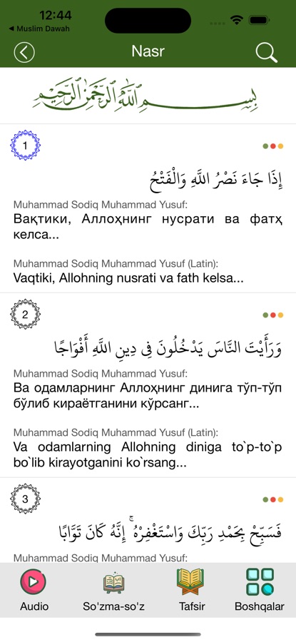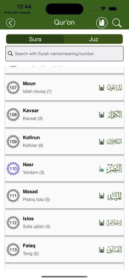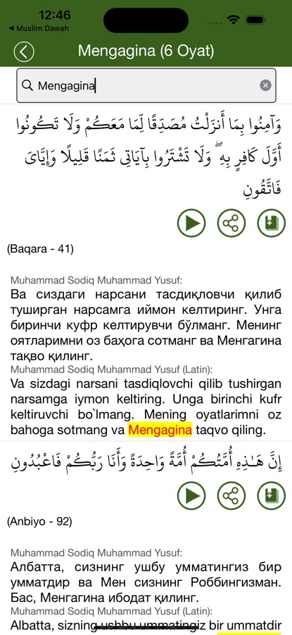 With this Islamic book app, you are getting Hafizi quran with real page-curl experience. This is not just a textual app, it is an audio Quran app. You can listen telwat of Quran ayats continuously (internet connection required). You can search words or topic in O’zbek (Ўзбек) on this iOS Quran app. Bookmark the ayat / verse you like / quote. Share the ayat / verse you want.