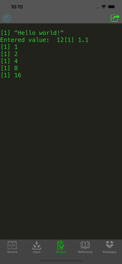 — This is a batch compiler; interactive programs, for instance swirl, are not supported. If your program provides an input prompt, enter the input in the Input tab prior to compilation. See the Reference tab in the app for code examples.